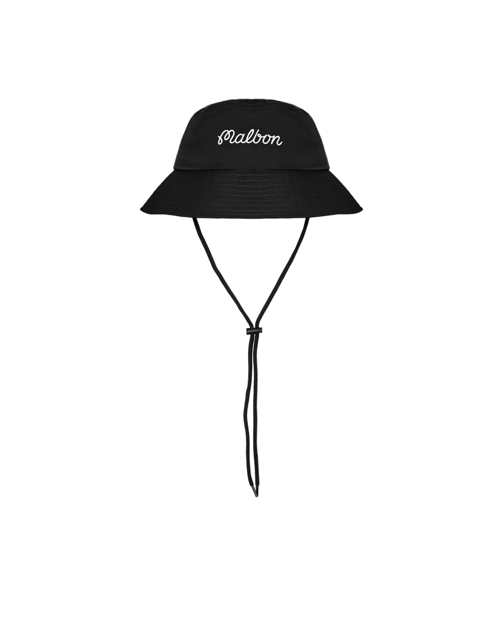 Crafted from lightweight polyester, it offers breathable comfort and quick-drying performanceâperfect for active days under the sun. An adjustable chin strap with cord lock ensures a secure fit when the wind picks up, or can be left loose for relaxed wear. The embroidered Malbon Script logo on the front adds premium branding that stands out subtly against the black fabric.