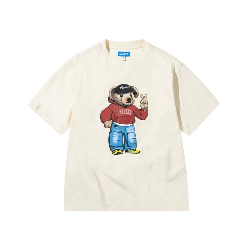 The Market Studios Fit Check Bear T-Shirt in Cream offers a clean, vintage-inspired take on a streetwear essential. Featuring the iconic bear logo printed on the chest, this tee is made from a soft, heavyweight cotton-poly blend for durability and everyday comfort. The boxy fit delivers a relaxed, oversized silhouette, perfect for effortless layering or a bold standalone look.